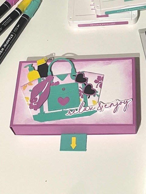 - Découper un rectangle de 3 x 8 cm et plier à 4 cm pour former la tirette à coller sous la boite.